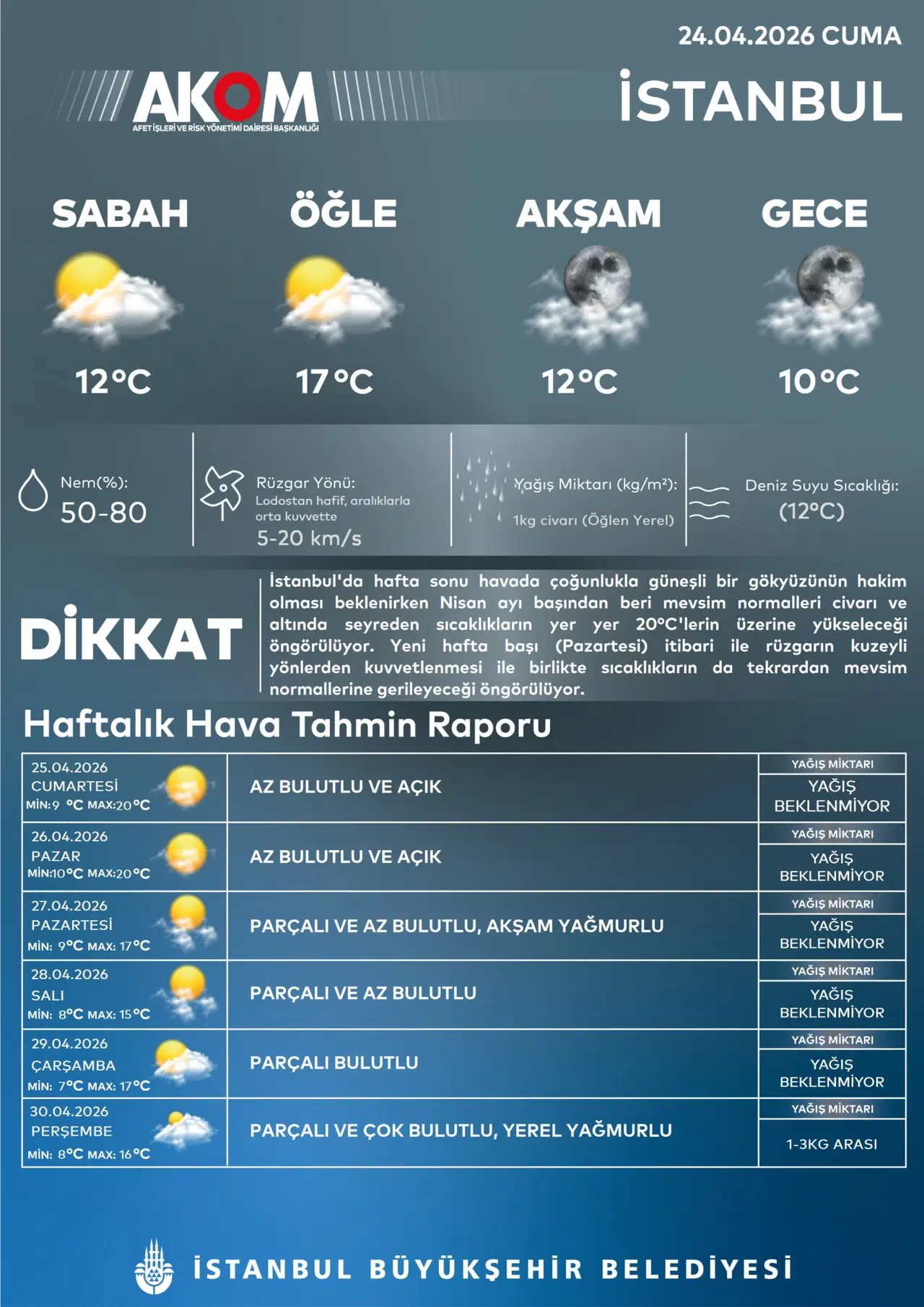 AKOM’un “Dikkat” notuna göre; hafta sonu havada çoğunlukla güneşli bir gökyüzü hakim olacak ve sıcaklıkların yer yer 20°C’lerin üzerine çıkması öngörülüyor. Cumartesi ve Pazar günleri havanın “Az Bulutlu ve Açık” olması beklenirken, her iki gün için de yağış tahmini bulunmuyor. Ancak bu sıcak hava dalgası kısa sürecek; yeni hafta başı (Pazartesi) itibarıyla rüzgarın kuzeyli yönlerden kuvvetlenmesiyle birlikte sıcaklıkların tekrardan mevsim normallerine gerileyeceği tahmin ediliyor. GÜN GÜN İSTANBUL HAVA DURUMU 24 Nisan Cuma (Bugün): Gündüz 17°C’yi bulan sıcaklığa öğle saatlerinde 1 kg civarı yerel yağış eşlik edebilir. 25-26 Nisan (Hafta Sonu): Hem Cumartesi hem de Pazar günü gökyüzü az bulutlu ve açık olacak, termometreler ise 20°C’yi gösterecek. 27-29 Nisan (Pazartesi-Çarşamba): Pazartesi günü rüzgarın kuzeyden kuvvetlenmesiyle hava 17°C’ye düşüyor ve akşam saatlerinde yağmur bekleniyor. Salı günü sıcaklık 15°C’ye kadar gerilerken, Çarşamba günü 17°C olacak. 30 Nisan Perşembe: Nisan ayının kapanışında yerel yağmurlu (1-3 kg) ve çok bulutlu bir hava (Max 16°C) İstanbulluları bekliyor. Yazı gezinmesi Kocaeli’de AKP’li Tahir Büyükakın 23 Nisan’da Atatürk’e yer vermedi: CHP’den yanıt gecikmedi