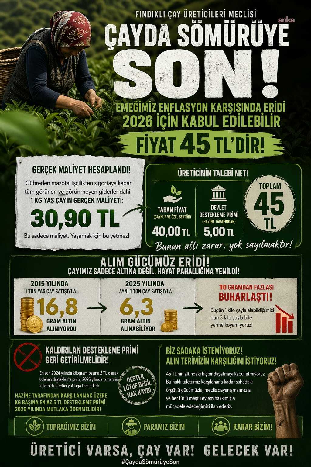 “Yıllardır Karadeniz’in sarp yamaçlarında alın teri döken biz çay üreticilerinin kaderi tarlaya hiç girmeyenlerin masa başında aldığı kararlara terk edilmiştir. Artan gübre fiyatları, enflasyon karşısında eriyen gelirimiz, gasp edilen destekleme primleri ve kotalar bahane edilerek özel sektörün dayattığı taban fiyatın altındaki sömürü alımları karşısında üretici savunmasız bırakılmıştır. Fındıklı Çay Üreticileri Meclisi, bıçağın kemiğe dayandığı bu düzene dur demek için üreticinin kurtarıcı beklemeden kendi hakkını bizzat savunmak zorunluluğundan doğmuştur.