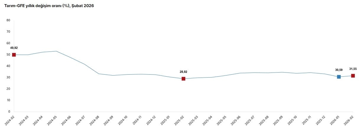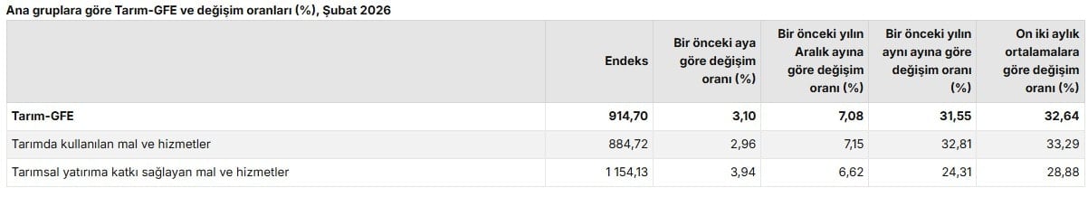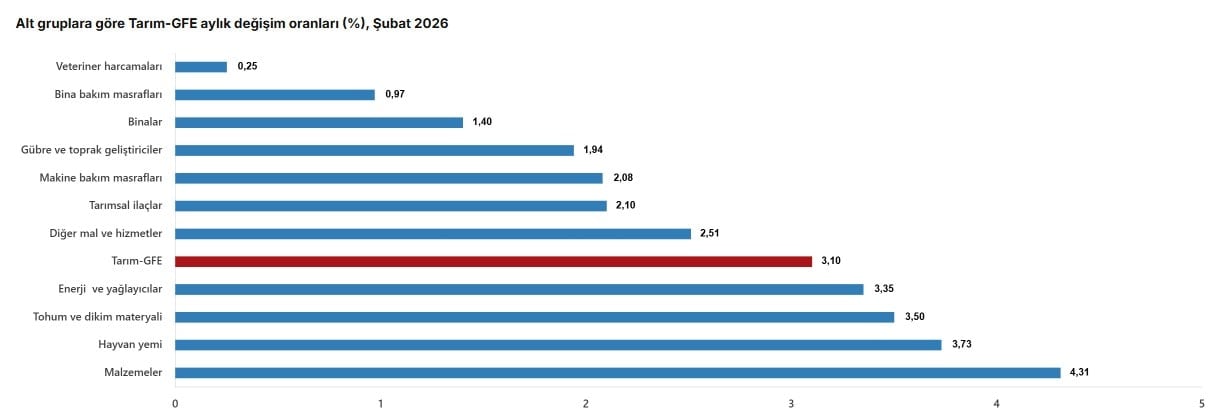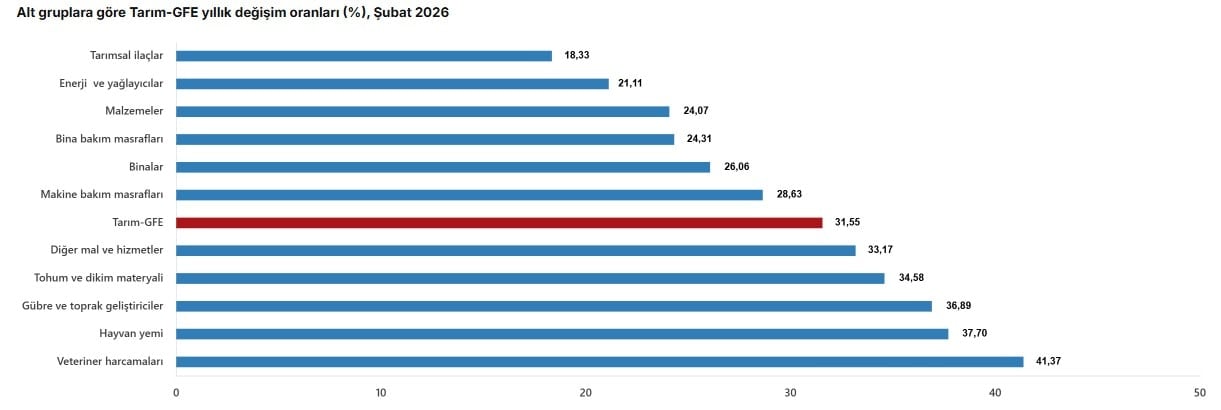 TÜİK şubat ayı tarımsal girdi fiyat endeksi rakamlarını açıkladı. Buna göre tarımsal girdi fiyatları şubatta aylık bazda yüzde 3,10 olurken, yıllık bazda yüzde 31,55 olarak kaydedildi. Tarım-GFE’de (2020=100), 2026 yılı Şubat ayında bir önceki aya göre %3,10 artış, bir önceki yılın Aralık ayına göre %7,08 artış, bir önceki yılın aynı ayına göre %31,55 artış ve on iki aylık ortalamalara göre %32,64 artış gerçekleşti. Ana gruplarda bir önceki aya göre, tarımda kullanılan mal ve hizmetler endeksinde %2,96 artış, tarımsal yatırıma katkı sağlayan mal ve hizmetler endeksinde %3,94 artış gerçekleşti. Bir önceki yılın aynı ayına göre tarımda kullanılan mal ve hizmetler endeksinde %32,81 artış, tarımsal yatırıma katkı sağlayan mal ve hizmetler endeksinde %24,31 artış gerçekleşti. Yıllık değişimin en yüksek olduğu alt grup %41,37 artış ile veteriner harcamaları, aylık değişimin en yüksek olduğu alt grup %4,31 artış ile malzemeler oldu. Yazı gezinmesi Finansal Check-Up Nedir? Nasıl Yapılır? Ne Gibi Faydalar Sağlar? Memur ve emekli zammı ne kadar olacak? Enflasyon tahminleri tabloyu netleştirdi