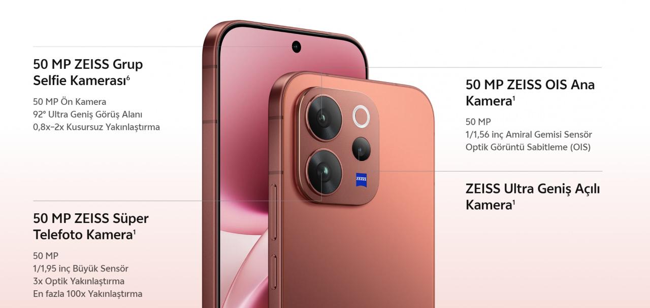 Arka kamera kurulumunda ise üçlü yapı bulunuyor. Ana sensör tarafında 50 MP çözünürlüklü ZEISS OIS ana kamera yer alıyor. Bu kamerada otomatik odaklama ve optik görüntü sabitleme desteği bulunurken, f/1.88 diyafram açıklığı sayesinde düşük ışık koşullarında da iddialı bir performans hedefleniyor. Sistem ayrıca 1/1,56 inç büyüklüğünde amiral gemisi sınıfı sensörle destekleniyor. Buna ek olarak 50 MP ZEISS süper telefoto kamera, 1/1,95 inç büyük sensör, OIS desteği, 3x optik yakınlaştırma ve 100x’e kadar dijital yakınlaştırma sunuyor. Ultra geniş açı tarafında ise 115 derecelik görüş açısına sahip 8 MP’lik bir kamera yer alıyor. Dosyada bazı tanıtım notlarında ultra geniş açı kamerası için ZEISS vurgusu yer alırken, teknik özellik tablosunda çözünürlük 8 MP olarak geçiyor. Bu yüzden cihazın resmi teknik konfigürasyonunda ultra geniş açının 8 MP olduğu görülüyor.
